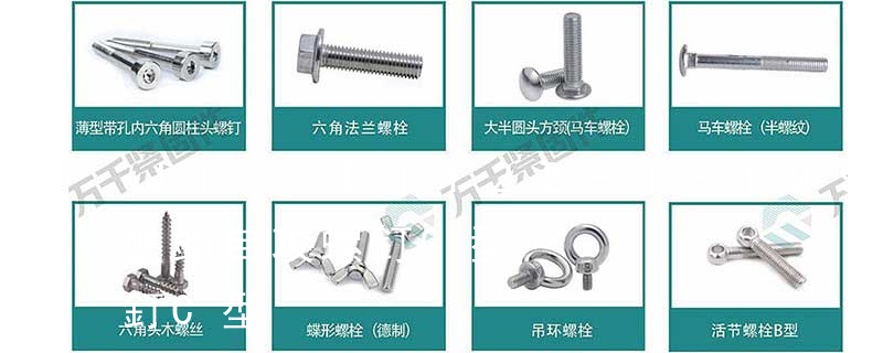 螺栓有:1、方頭螺栓,2、半圓頭方頸螺栓,3、十字槽盤頭螺釘,4、內(nèi)六角沉頭螺釘,5、方螺母C級,6、蝶形螺母,7、六角頭螺栓,8、十字槽盤頭自攻螺釘。大小有M18、M6、M8、M16、M10、M12、M14、M20等型號。通常用
