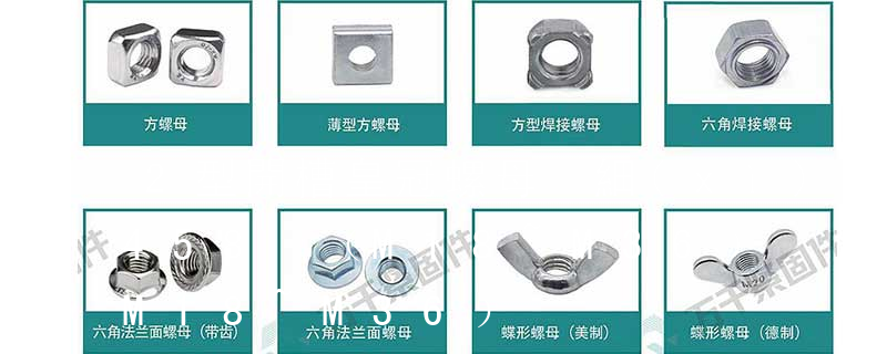 六角法蘭面螺母細(xì)牙GB/T 6177.2—2000;1型六角開槽螺母—A和B級(jí)GB 6178—86;1型六角開槽螺母—C級(jí)GB 6179—86;2型六角開槽螺母—A和B級(jí)GB 6180—86;六角開槽薄螺母—A和B級(jí)GB 6181—86;2型非金屬嵌件六角鎖緊 大小不同,螺紋不等分為不同的規(guī)格.一般國(guó)標(biāo)、德標(biāo)用M表示(例如M8、M16),美制、英制則用分?jǐn)?shù)或#表示規(guī)格(如8#、10#、